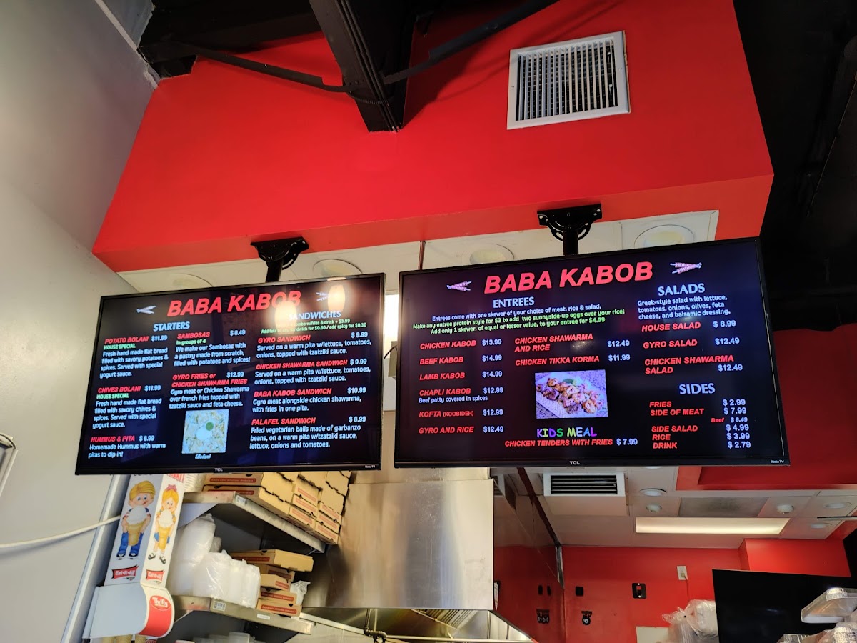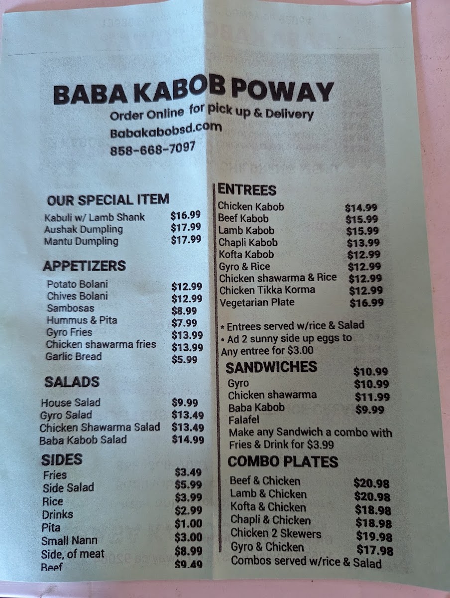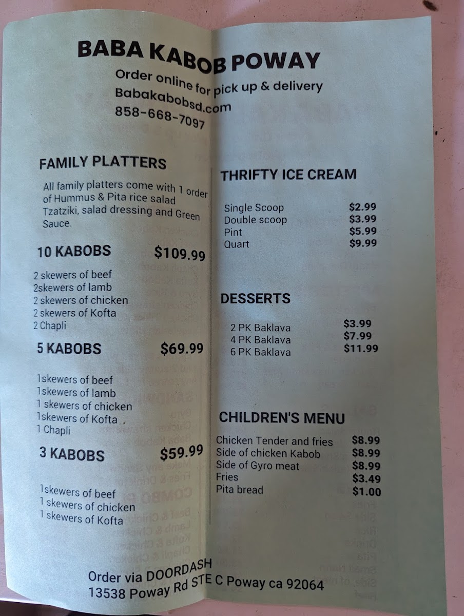 From a reviewer’s perspective, the menu at Baba Kabob Poway delivers a well-rounded snapshot of comfort food and Middle Eastern-inspired classics that feels both familiar and satisfying. The salad selection sets a fresh tone with options like the House Salad, Chicken Shawarma Salad, Gyro Salad, and even Flatbread (Small Naan) served alongside Garlic Sauce, making lighter choices flavorful rather than plain. Starters such as Sambosas, Garlic Bread, Gyro Fries, Hummus & Pita, and Chives (Gandana) Bolani are ideal for sharing and clearly designed to warm up the palate. The sandwich lineup-including the Baba Kabob Sandwich, Falafel Sandwich, Chicken Shawarma Sandwich, and Gyro Sandwich-offers dependable handheld options that showcase the restaurant’s core flavors. For heartier plates, entrees like CHEESE BURGER COMBO WITH FRIES & DRINK, Chicken Tikka Korma, Kofta (Kobideh) Gyro & Rice, and Aushak add variety, blending classic American comfort with traditional dishes. Sides such as Falafel Side, Rice (Side), Chicken Kabob (Meat Only), Hummus, and Chapli Kbob (Meat Only) allow diners to customize meals or build their own combinations. Finally, the inclusion of Thrifty Ice Cream flavors-Vanilla, Chocolate Brownie, Pistachios Nut, Cotton Candy, and Rocky Road-provides a nostalgic and sweet ending. Overall, the menu feels thoughtfully composed, offering something for casual diners, families, and anyone looking for a comforting, well-balanced meal.