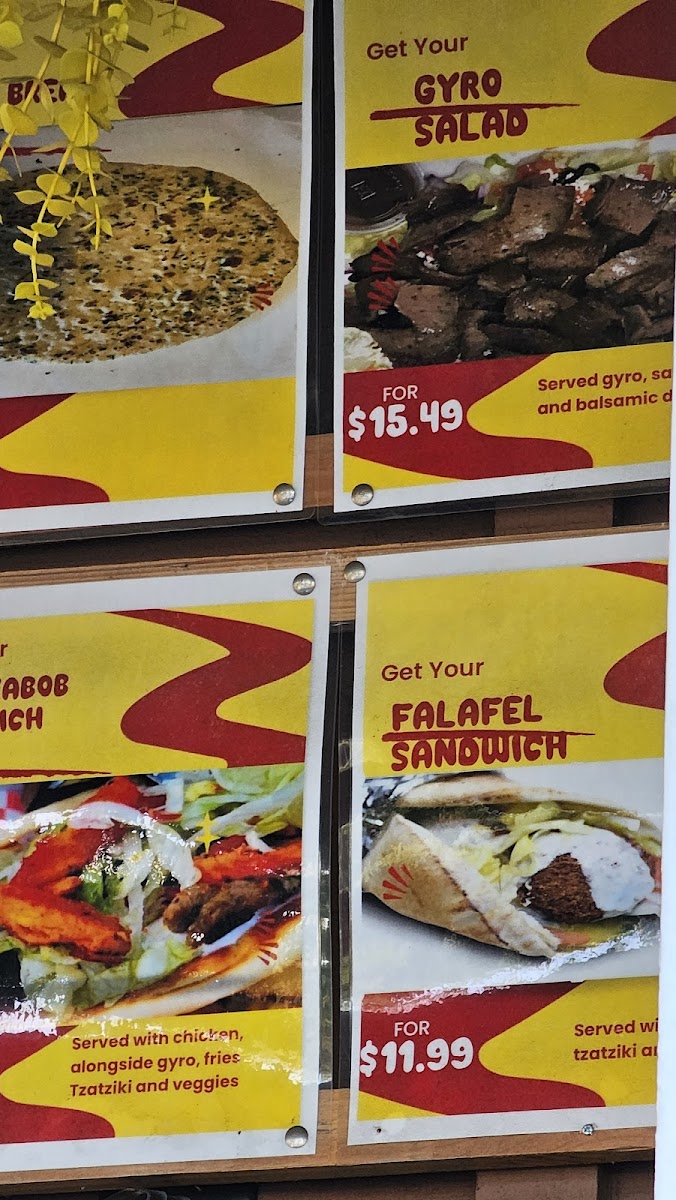 Made on a warm pita with chicken,gyro meat, fries ,lettuce tomatoes, onions and topped with tzatziki sauce.